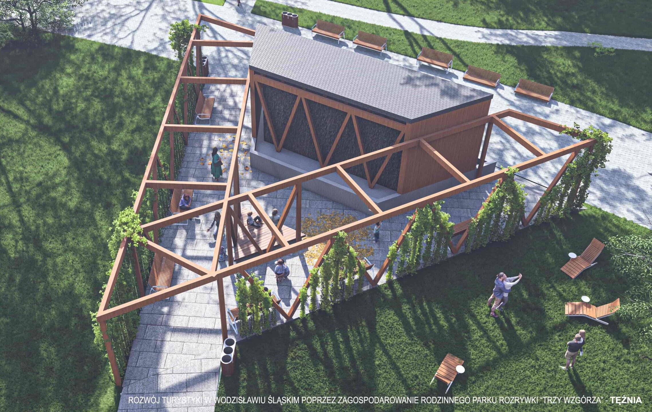Wykonawca wybuduje także tężnię solankową z pergolą, która stworzy zdrowotną przestrzeń relaksu. Dodatkowo zacieni miejsce do odpoczynku i poprawi estetykę terenu. Całość zostanie wykonana z drewna.