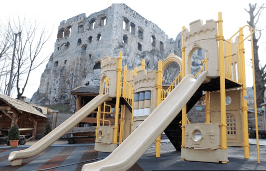 Zaraz po wejściu najmłodsi mogą skorzystać z placu zabaw, a dorośli obserwując pociechy naładować akumulatory w małej gastronomii, gdzie możemy zjeść dobre lodowe desery przyrządzane według miejscowej receptury oraz gofry własnego wypieku. Najbardziej klientów zaskakują jednak toalety, które zostały już oficjalnie ogłoszone najlepszymi sanitariatami zamków jurajskich. Po tej stronie parku, możemy jeszcze obejrzeć koło młyńskie i przeprowadzić obserwację okolicy ze średniowiecznej wieży wa- rownej. Wszystkie konstrukcje w parku, które nie są miniaturami, włącznie z ławkami i bramami wejściowymi wykonano pieczołowicie z drewna – co nadaje miejscu posmak ludowości.