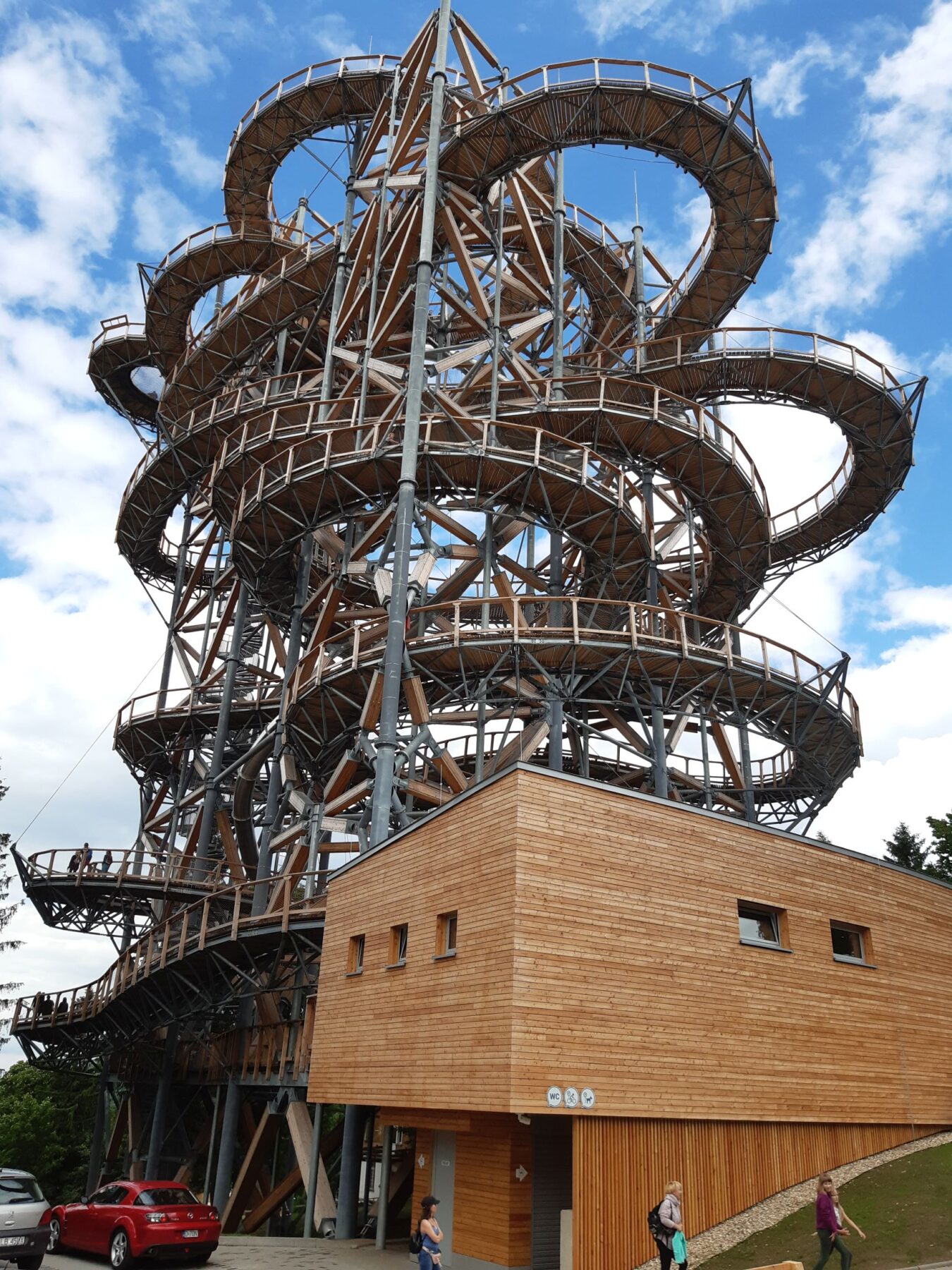 By turyści mogli lepiej się zorientować na co patrzą, twórcy ścieżki na wieńczącym ją cokole umieścili strzałki i nazwy gór widniejących na horyzoncie. Wróćmy jednak na ścieżkę. Jej wieża widokowa ma wysokość 65 metrów wysokości, a wewnątrz szczytowego chodnika rozpięto siatkę po której mogą chodzić goście bez lęku wysokości. Piętro niżej znajduje się wlot do rurowej zjeżdżalni, która w kilka sekund pozwala znaleźć się na dole.