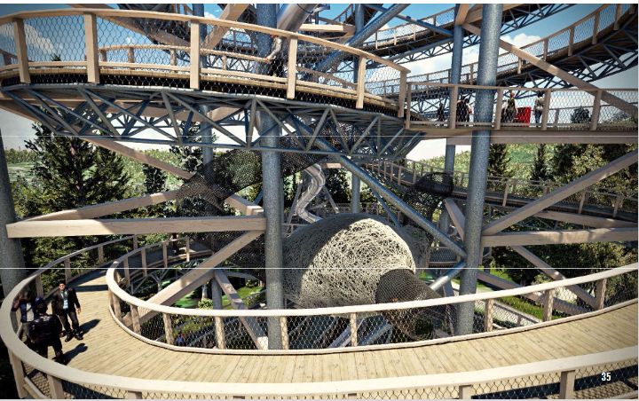 „Na szczyt Sky Walk poprowadzi 850-metrowa ścieżka. Przejście między piętrami uatrakcyjnia wiele punktów widokowych i atrakcji takich jak np. kokon pająka – zabawna plątanina sieci, która przypadnie do gustu szczególnie dzieciom. Na szczycie, na zdobywców czeka między innymi siatka relaksacyjna w kształcie kropli, mapy z panoramą gór, czy też przeszklona platforma widokowa. Drogę powrotną urozmaica zjazd ze 105-metrowej zjeżdżalni. Na końcu wycieczki czeka potężny zastrzyk adrenaliny, w ciągu kilku sekund nasi Goście dostaną się z chmur na ziemię”.