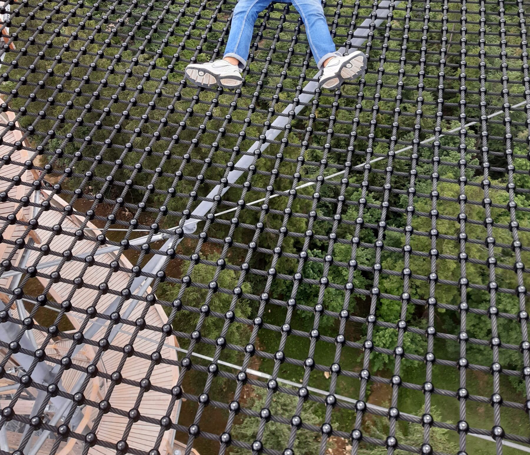 Na szczycie znajdziemy też werandę ze szklaną podłogą i barierkami. Szkło wygląda na solidne i grube, a jednak mimo to strach jest. Jednak moim zdaniem, ani siatka, ani też szklana weranda, ani nawet rurowa zjeżdżalnia nie zapewniają takiej zabawy jak umieszczony pomiędzy drugim od góry, a przedostatnim piętrem wieży, siatkowy kokon.